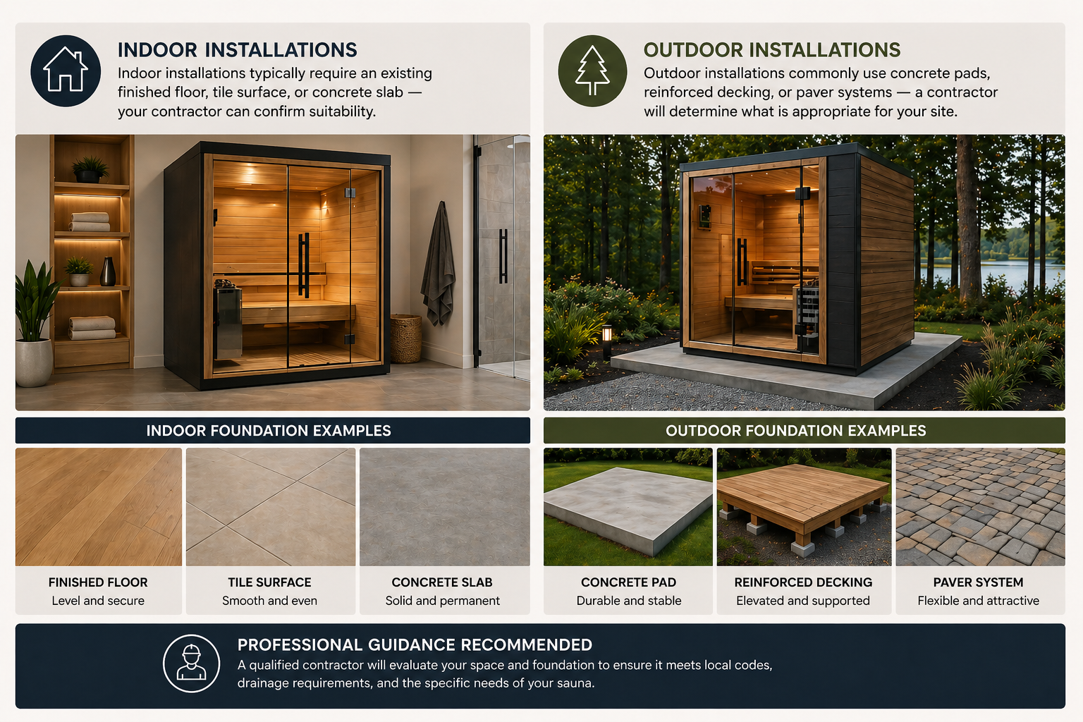 Every sauna requires a stable, level surface. The appropriate foundation depends on your specific model, installation environment, and local building requirements. A licensed contractor should evaluate and prepare your foundation — this is not a DIY consideration for a high-value installation